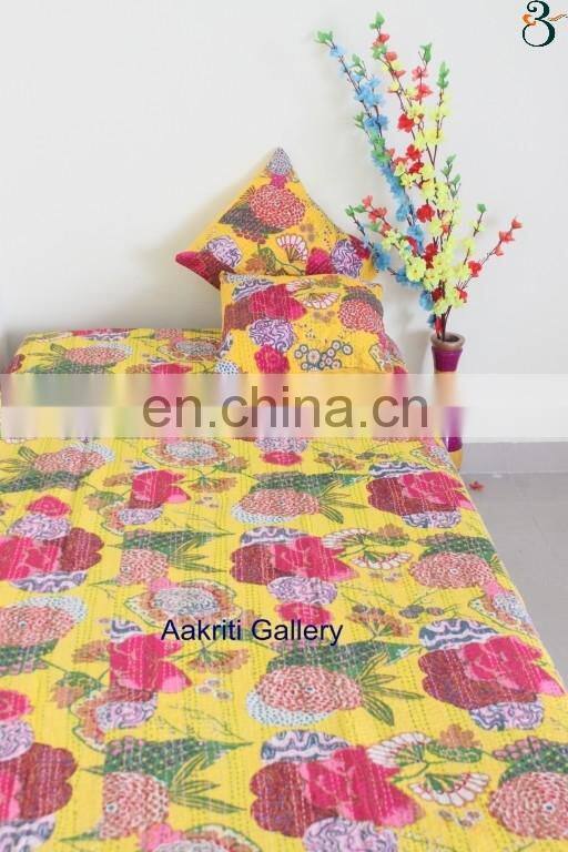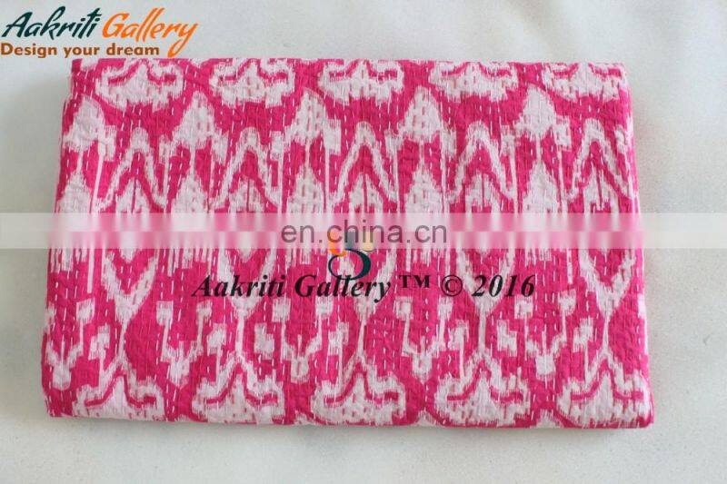 A Very light weight pure cotton hand print kantha Quilt, Hand Printed in various patterns and colors in Sanganer with Screens this AC Quilt is good to be used as AC quilts even, being very light weight. The quality of kantha quilting is measured in number of stitches per inch. Quilts with higher number of stitches being more labor intensive are higher priced.Comes in sizes and so is very good to carry for travel as well. Kantha are world famous for their unique style of stitching pattern.