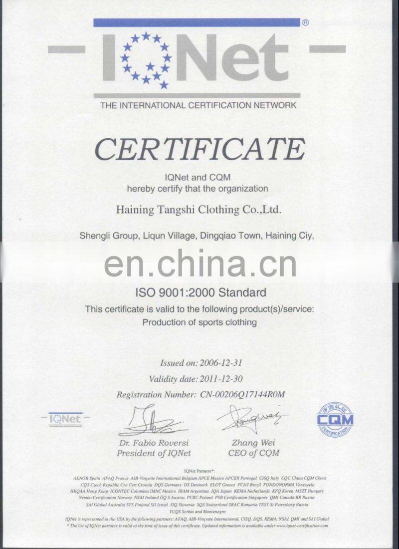 We have a factory named Haining Tangshi Garments Co., Ltd. It was established in 2004, Zhejiang, China. We specialized in ice hockey wear, ice hockey socks,fitness tight in many years. Specifically for the team or individual to do personalized custom. The material of products is 100% polyester, knitted fabrics. And provide pringting and embroidery technology. So please believe that we have a rich experence in prouction.