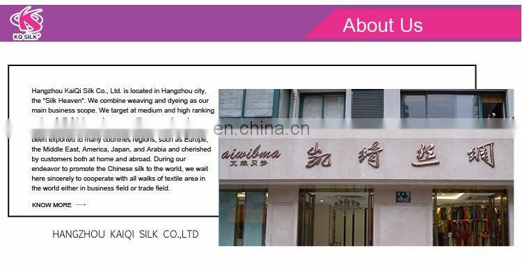 Hangzhou KaiQi Silk Co., Ltd. is located in Hangzhou city, the "Silk Heaven". We combine weaving and dyeing as our main business scope. We target at medium and high ranking series of silk fabrics and scarves with our own brand "AIWIBMA". Our products are well selling in China and have been exported to many countries regions, such as Europe, the Middle East, America, Japan, and Arabia and cherished by customers both at home and abroad. During our endeavor to promote the Chinese silk to the world, we wait here sincerely to cooperate with all walks of textile area in the world either in business field or trade field.