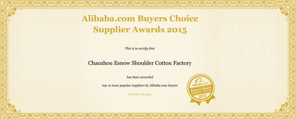 Esnow Shoulder Cotton Factory is established in 2005, our factory has spent more than 11 years to persue and improve our technique and services.We operate strictly according to ISO9001 quality system and our products pass SGS test. With advanced equipments, professional personnel, strict quality inspection and excellent service. We gained good reputation and favor from our customers in the past years.