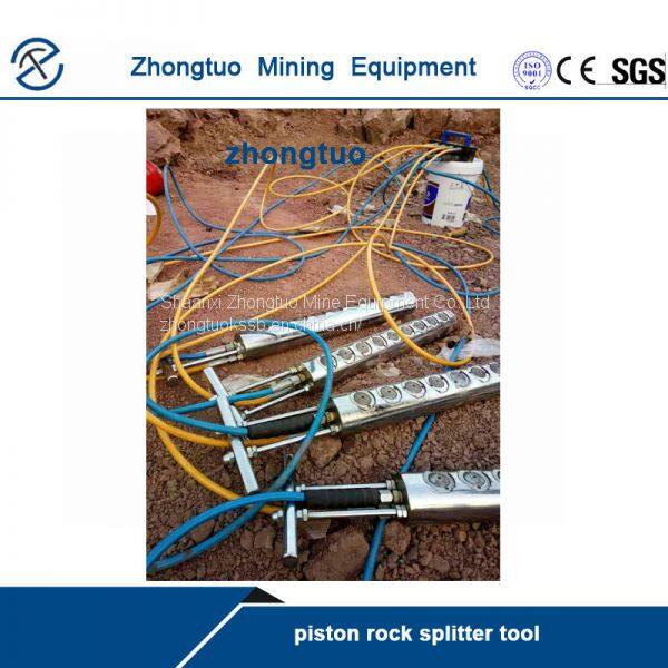 Piston rock splitter tool is new type hole piston type hydraulic rock splitter, hydraulic soundless blasting, hand hold rock splitter improved, and alternative of Expansive Demolition Agent , first need to drill hole 90mm 105mm by DTH hammer drill, insert splitting rods with multi piston cylinder button press rock by super high pressure of 1,500 kgf/cm2 (150 MPA) which is not possible from other rock demolition power packs at several seconds to splitting big block from rock body.