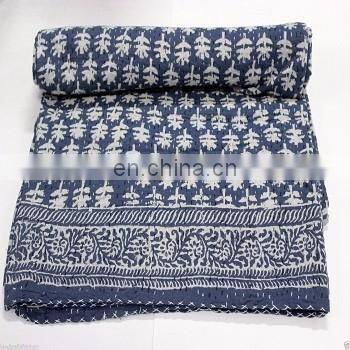 Village Women Made Kantha Bed Cover Indigo Dye Kantha Quilts Hand Quilted Throw