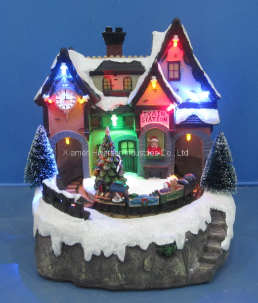 Polyresin Christmas Crafts Decoration 8'' LED Train Station With Moving Train