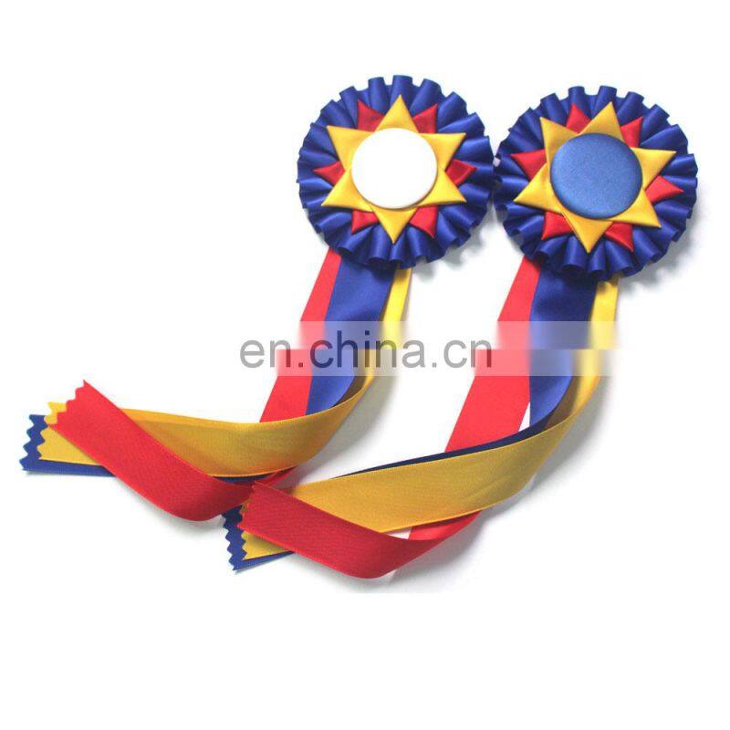 Our Ribbon Rosette's flower part and tassel part could make by material - Polyester,satin,organza,grosgrain and nylon .The badge cover and back support part could make by tin,ABS and cardboard.We also support to print your logo or your images designs and Multi-size for you to choice .