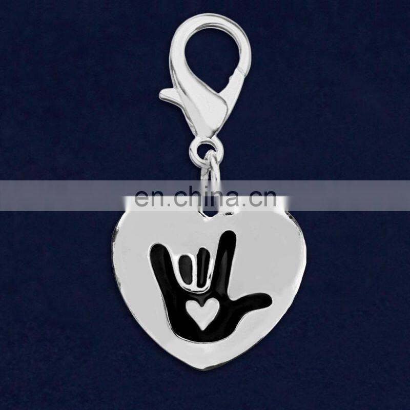 Deafness Awareness Heart Charm Silver Tone Black Enamel I Love You Sign Language Symbol Heart Charm