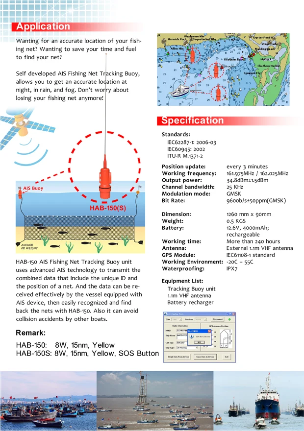 HAB-80 AIS Fishing Net Tracking Buoy unit uses advanced AIS technology to transmit the combined data that include the unique ID and the position of a net. And the data can be received effectively by the vessel equipped with AIS device, then easily recognized and find back the nets with HAB-80. Also it can avoid collision accidents by other boats.
