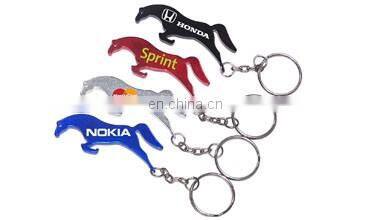 Horse shape bottle opener with key chain. A great gift of beer bottle and pop bottle key holder! Essence of the wild life. Solid aluminum construction with metallic color finish. Laser engraving is available. 2 3/8" L x 1" W