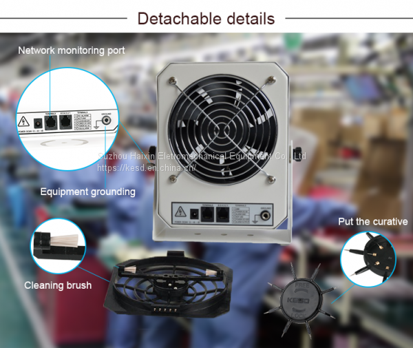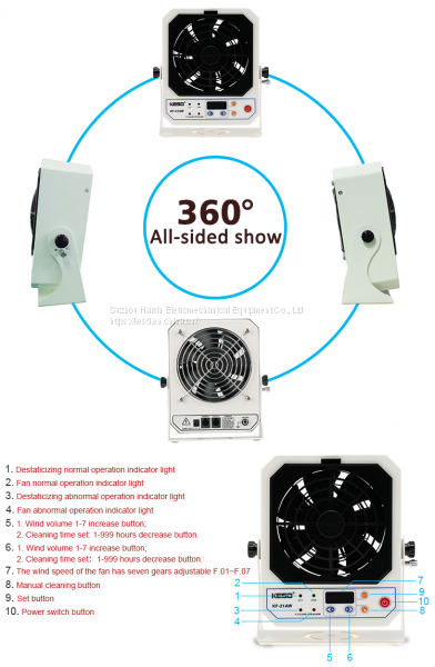This ionizing air blower is a kind of static eliminating equipment putting on the desk which supports balance ion flow and huge coverage. It is able to neutrilize and eliminate the static charge which spreading widely and not easy to touch. It is desire eleminating equipment of delicate electronic products, medication line of set-up, printing, packing, and delicate products.Discharge effect is still reduced from 1000v to 10v.It is used in the thousands level clean room.It is a excellent industrial product in eliminating static electricity.