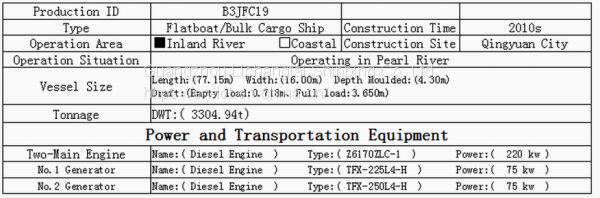 Flatboat specially transports dry bulk cargo and is suitable for transporting bulk grains, building stones, ore sand, coal, etc. The boat is not installed with hoisting equipment but completes loading and unloading of cargo by the hoisting equipment or loading and unloading machinery on the dock. Generally a flatboat has one cargo space only. The hatch is wide; the top of the cargo space is totally open; it is a rectangular cabin-shaped structure. Most hulls are large and the cargo space volume is huge. The engine room and the superstructure are located in the tail, so the boat is tail type ship.
