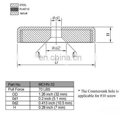 The holding power of 70 lbs is when the cup directly contacts with the steel. The outer diameter of the magnet is 1.26" (32 mm). The mounting hole in the center is 0.21" (5.5mm) which allows a #10 screw pass through. The total thickness of the assembly is 0.28" (7 mm).