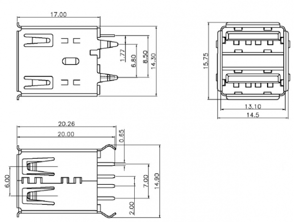 USB A Type Female USB 2.0 header double stack connector, right angle PCB mount usb connector