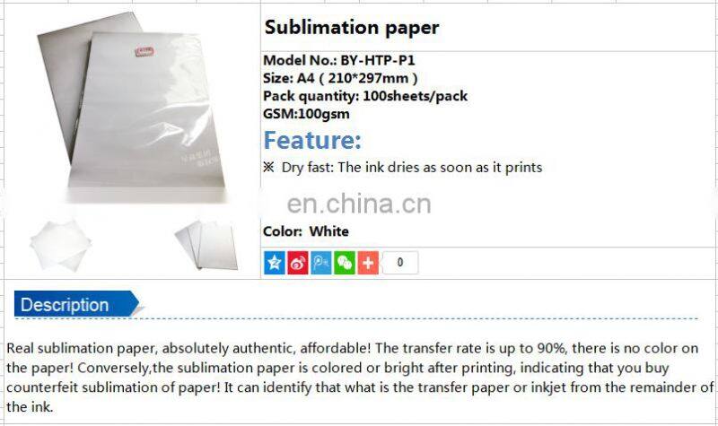 | Notes | It must be used thermal transfer ink, printing mirror images to be transferred in the sublimation paper, stamping temperature 170-200 ℃, time of 85-40 seconds. |