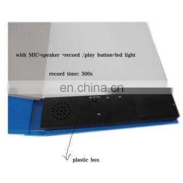 Voice recording book is a very perfect design for kid`s education ,which can be applied in home and school .you can wrrite any words you want to wrrite and record anything you want to say .when you think old words and voice are of no use ,you can clean them and record new voice instead of the old voice .it is really very convenient for kid`s education .Besides ,for many business man and work-holic,you are very very busy every day .so you don`t have time to take care you kids and talk to them ,This recording book will be good choose for you ! You can record any words you want to tell your kids .Even you are out of your family ,your children also can hear your voice by this recording book.very a good recordable book ,hope you will like it .