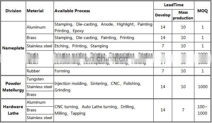 A: Due to most of our products are customized, so their leadtime are not fixed. But you can find the estimate LeadTime as below that sectioned by materials and processes.