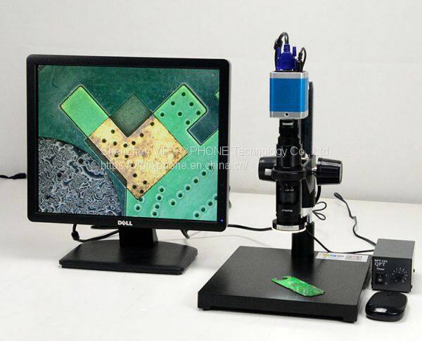 VGA 7-45X Trinocular Stereo Microscope is professional mobile phone circuit board repair equipment, it is designed to aquire a magnified view of PCB or electronic components when soldering and repairing phone circuit board. The miscroscope with optional VGA USB AV video camera adapter and LED light source is available for different zoom options, which will make your phone repairs more easily and successful!