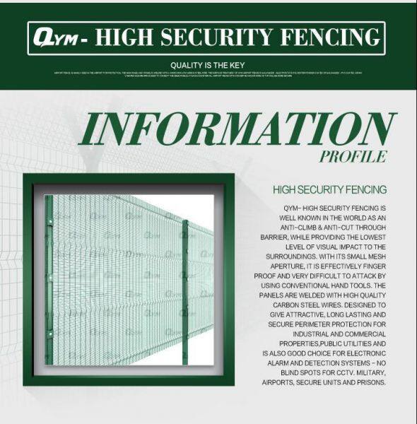 QYM- high security fencing is well known in the world as an anti-climb & anti-cut through barrier, while providing the lowest level of visual impact to the surroundings. With its small mesh aperture, it is effectively finger proof and very difficult to attack by using conventional hand tools. The panels are welded with high quality carbon steel wires. Designed to give attractive, long lasting and secure perimeter protection for industrial and commercial properties,public utilities and is also good choice for electronic alarm and detection systems - no blind spots for CCTV. Military, airports, secure units and prisons.