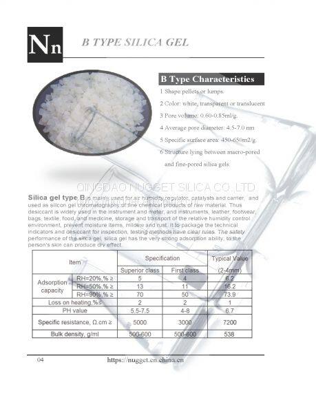 Silica gel type B is mainly used for air humidity regulator, catalysts and carrier, and used as silicon gel chromatography of fine chemical products of raw material. Thus desiccant is widely used in the instrument and meter, and instruments, leather, footwear, bags, textile, food, and medicine, storage and transport of the relative humidity control environment, prevent moisture items, mildew and rust. It to package the technical indicators and desiccant for inspection, testing methods have clear rules. The safety performance of the silica gel, silica gel has the very strong adsorption ability, to the person's skin can produce dry effect.