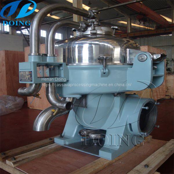 After that, those small pieces become a kind of mash. Then centrifuge sieve is used for the extraction of starch from the materials, remove fiber from starch slurry. the machine with automatic front and back washing system guarantee good screen penetration and high-efficiency operation. Then fine fiber sieve fatherly separates small fiber from starch slurry according to its own gravity and low centrifugal force function by screen mesh inside the drum. The next step is to separate protein, cell liquid out of starch milk, two machines are used to separate them. One is disc separator. It is one kind of settling centrifuge, which use centrifugal force to accelerate separating process. It can be used for enrichment and purification of starch slurry.