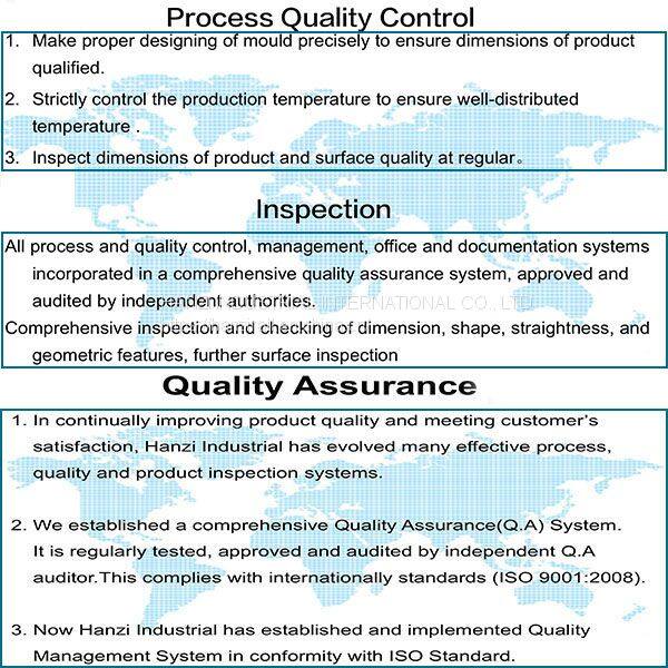 Hanzi Industrial established a comprehensive Quality Assurance (Q.A) System. It is regularly tested,approved and audited by independent Q.A auditor. This complies with internationally standards ISO 9001: 2008.