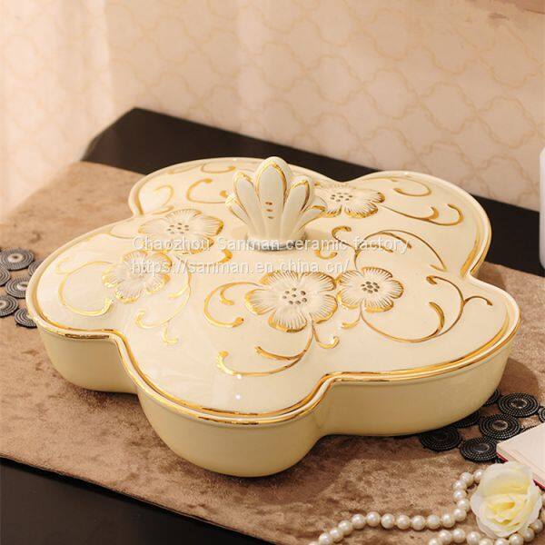 Cream Gold Ceramics Golden Hand Painted Luxury New Design Unique Fruit Tray With Lid