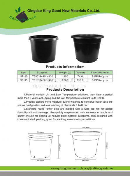 Qingdao King Good New Materials Co., Ltd. the Nursery Pots/Containers (flower pots) use of high quality raw materials of PP, PE and POE three kinds of raw materials and accurate proportioning, give full play to the advantages of three kinds of raw materials, greatly improve and enhance the quality of products, and prolongs the service life of the Nursery Pot. Nursery Pots/Containers (flower pots) structure design is unique, balanced growth of drainage and ventilation function help flowers grows up. The special design edge structure of the gallon pot greatly facilitates the transportation, loading and storage. Widely used in flower, nursery plant, vegetable, cotton, watermelon, herbs.