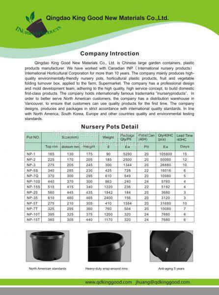 Qingdao King Good New Materials Co., Ltd. Produce of Gallon Pots(nursery pots/container), including UV anti-aging additives, long service life, outdoor use can achieve 3 years; At the same time it extrusion resistant, not easy deformation, not easy damaged, plate light energy saving, convenient and plant transplanting, cost savings, green environmental protection, 100% recyclable, professional for evergreen plants such as trees, shrubs, flowers design, it is a large garden at domestic and abroad, garden nursery seedling production the best Nursery container, Qingdao King Good New Materials Co., Ltd. making the Gallon Pots(nursery pots/container) products are exported to Europe, the United States, Canada, the Middle East all over the world.