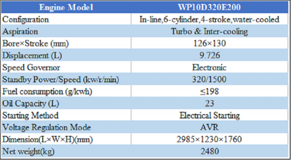 Weichai 250kw Diesel Generator Set 300kva Generator Engine