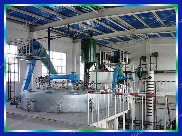 Flakes or cake will be obtained from the pretreatment plant and then into extraction plant to get crude oil. The production processes include extraction, wet meal evaposeparation, mixed oil evaporation, crude oil degumming, and solvent recovery process and so on. The feed material come from prepress plant into the extractor by feeding scraper conveyor, the material in the extractor vessel from the feed port to the discharge port, by blended oil which gradually decreasing its concentration to do spray and soaking, and finally spray with fresh solvent, after drain area will be sent out of extractor and into the wet meal scraper. The most concentrated mixture of oil from the pump into a spin liquid separator to remove impurity after automaticcleaning filter, and then staging into the mixing oil temporary storage tank. Extracted crude oil is extracted from the bottom of the stripper, and then through first steam mixed oil to finish heat exchange, after cooled by crude oil cooler into degumming system, finally this kind of oil into storage tank outside the workshop.