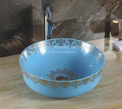 Luxury hotel bathroom ceramic round shape blue color wash hand basin sink with european popular design