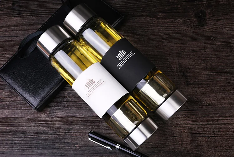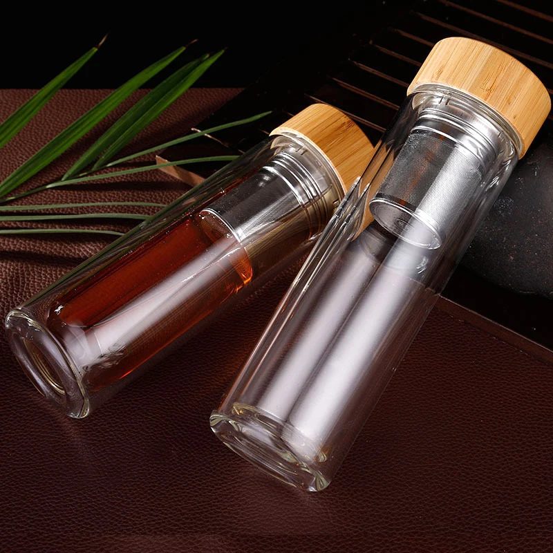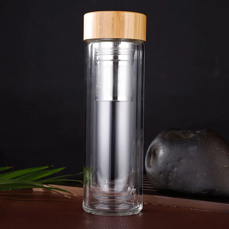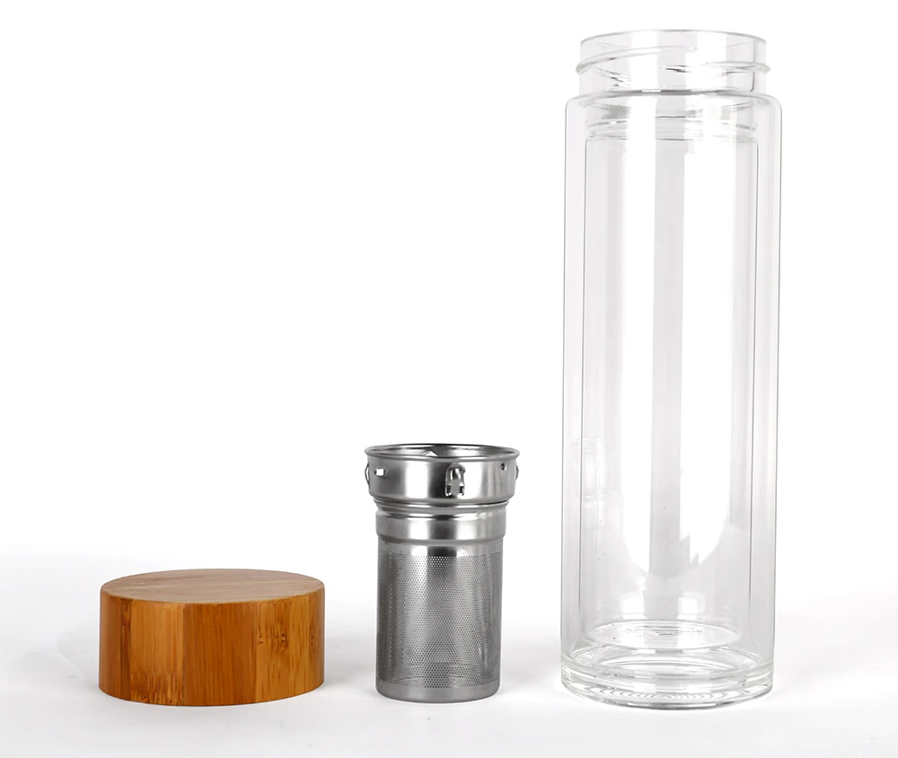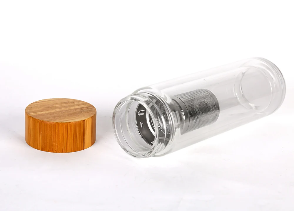 Double Wall Eco Pyrex Borosilicate Glass Tea Filter Infuser Drinking Water Bottle With Top Bamboo Lid