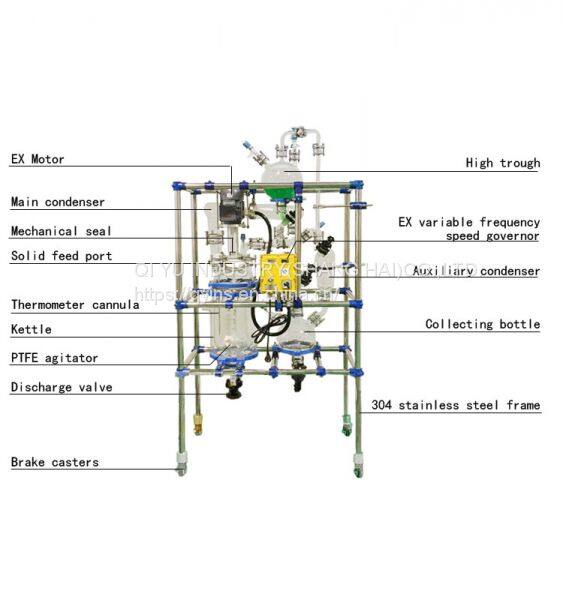 The glass reactor is designed for double layer, and the inner layer is put into the reaction material, which can be stirred and distilled, and the interlayer can be circulated or cooled by different cold and heat sources (freezing solution, hot water or hot oil).