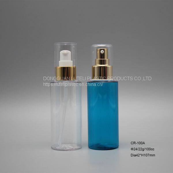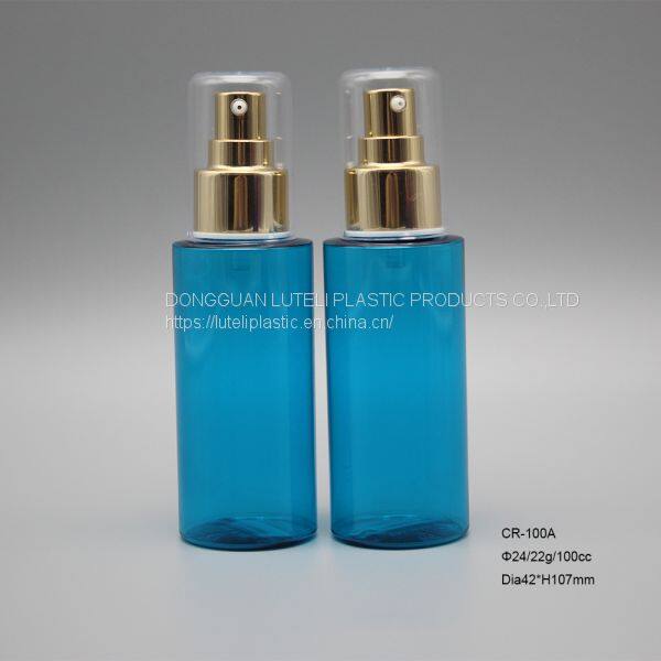 Pictures of CR-100A Wholesale 100cc blue PETG plastic personal care lotion cosmetic bottle with gold sprayer pump