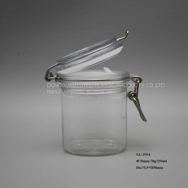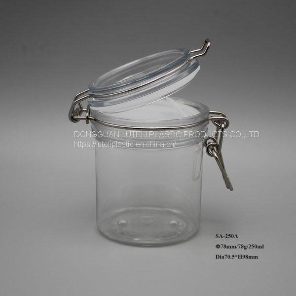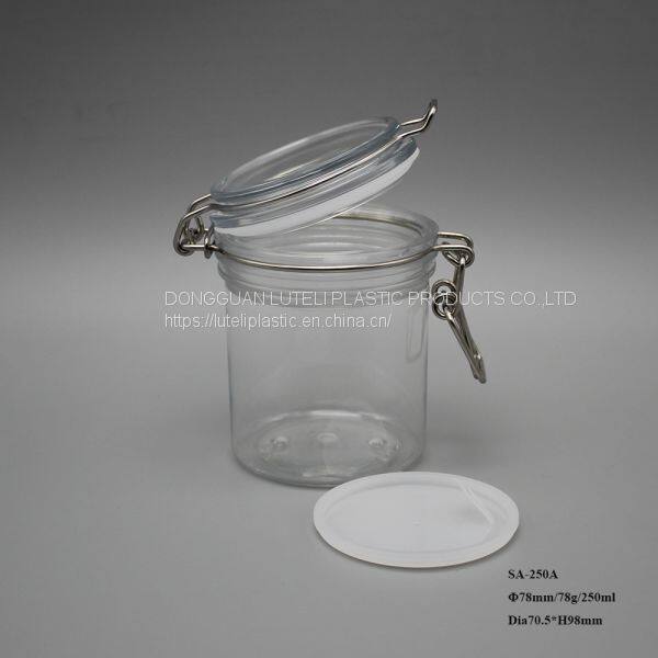 250ml round PET plastic beauty cosmetic empty jar and transparent container with metal clip for 250g face care cream