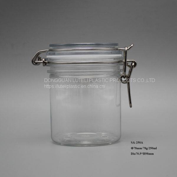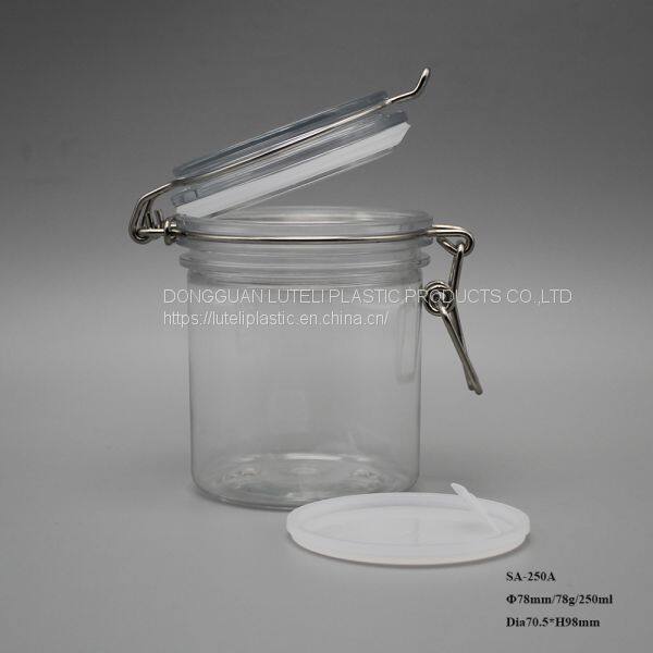 Pictures of SA-250A 250ml round PET plastic beauty cosmetic empty jar and transparent container with metal clip for 250g face care cream