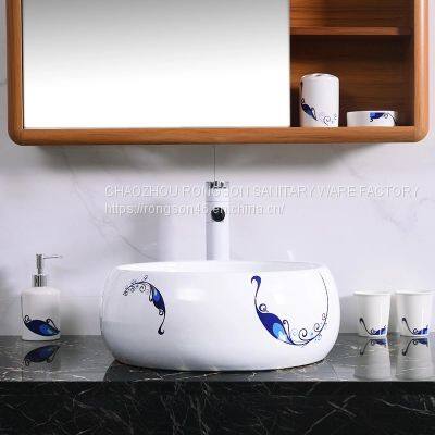 Small size round shape tabletop no hole wash hand basin sink with single printed