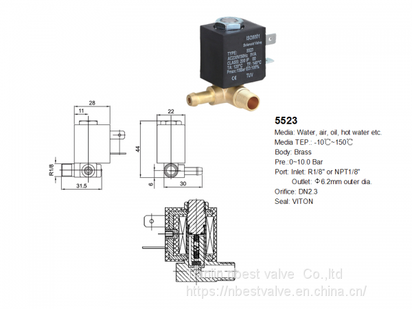 1)Direct acting miniature construction at low power consumption 2)With TUV certificate for household appliance use like coffee machine,electrical iron,steam cleaner 3)Applied to low pressure system,open from 0 bar |