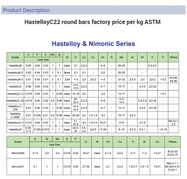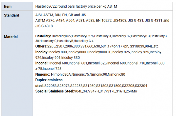 Hastelloy C22 Round Bars Factory Price per kg ASTM