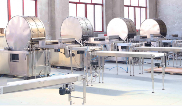 Put the prepared pulp into the barrel, when the baking wheel is heated to 160 C, start the pulp pump to deliver the pulp to the nozzle, operate the clutch lever, so that the pulp adheres to the arc surface of the baking wheel. When the baking wheel rotates over 270-300 degrees, the pulp matures and automatically separates from the baking wheel to form a fixed thickness spring roll skin.