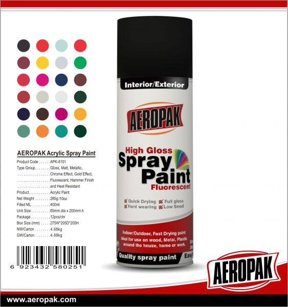 Aeropak spray paint, acrylic color spray paints MSDS aerosol spray paint is a high quality quick drying high gloss paint. It's ideal for odd jobs and touch ups around the house, office or work. It's perfect for indoor or outdoor use on metal, wood, fibreglass and most surfaces.