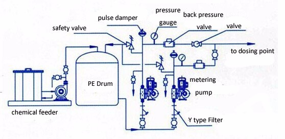 Dosing system is mainly composed of solution drum,mixer tank,metering pump,level gauge,electronic control,pipeline,valve,safety valve and etc.