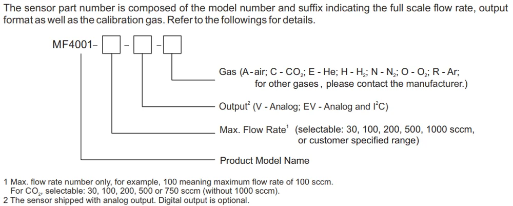 The MF4001 can be used in a wide range of applications inculding instrumentation(e.g. GC mass spectrometry), leak detection, process control, gas flow metrology as well as medical applications. The MF4001 requires a power supply of 8~24V DC and provides an analog and/or digital user interface. The analog output is linearized from 0.5 to 4.5V DC corresponding with flow rate from 0 to full scale. The digital output is via RS232/12C. The communication protocol of the RS232 and I2C can be found in this manual.