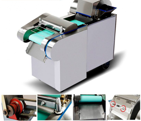 Leaf vegetable: conveyor belt conveys raw materials. The speed of rotary knife and belt are independently controlled by frequency converter. The size of cut vegetables can be adjusted by 1 - 60 mm.