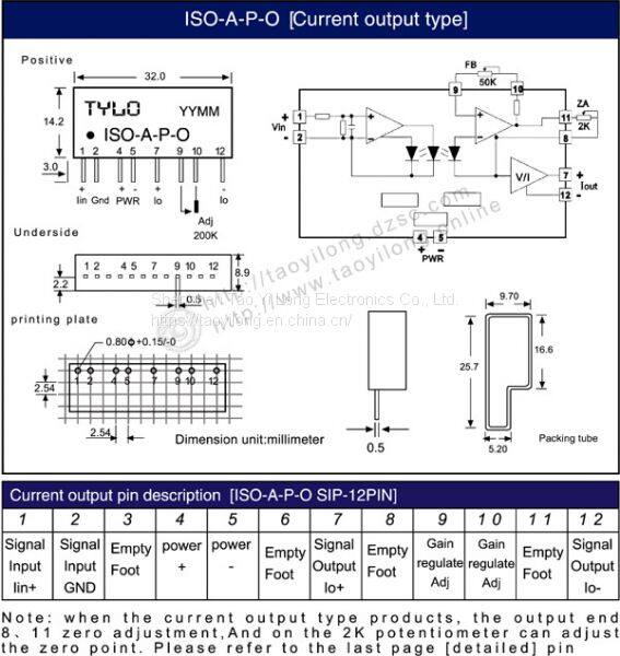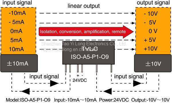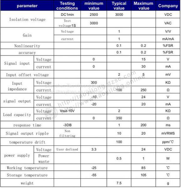 ISO photoelectric isolation amplifier transmitter series is a hybrid integrated circuit which will be amplified and converted into a proportional output analog signal by the DC signal isolation and amplification. The IC is integrated with a plurality of isolated DC/DC converter power supply and a set of photoelectric coupling analog signal isolation circuit, input and output side wide range of the input voltage and internal isolation measures to enable the chip to achieve signal input / output / auxiliary power supply 3KVDC three insulation voltage. Easy to use, no external components to achieve the signal current source long-term transmission. The object and data acquisition system are isolated, which can improve the common mode rejection ratio, and protect the electronic instrument equipment and personal safety.