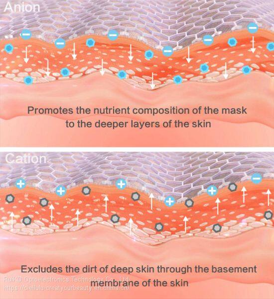 Ciellulu Ion Mask Device utilizes the directional movement of cation and anion to discharge dirt of the deeply pores through the basement membrane of the skin,maximizing the penetration effect of the essence in the mask,supplying the necessary nutrients to the skin,and accelerating the circulation and promoting the transport of nutrients to the deeper layers of the skin.Tighten and whiten your skin