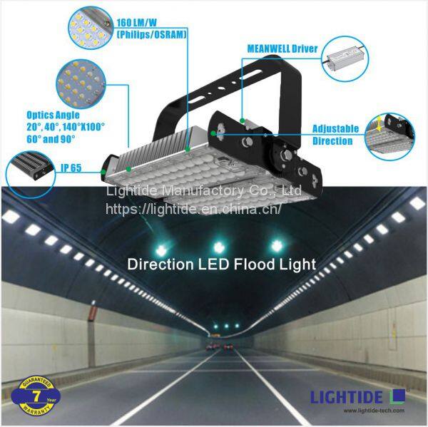 Directional LED Tunnel Light Fixture features adjustable-direction module design with 140-160 LPW output. Osram or Philips SMD LED and Meanwell driver provides 5 years limited warranty. Many beam angles of PMMA lens designs which deliver maximum beam control for tunnel, square, road lighting, warehouse, building and hotel lighting etc.