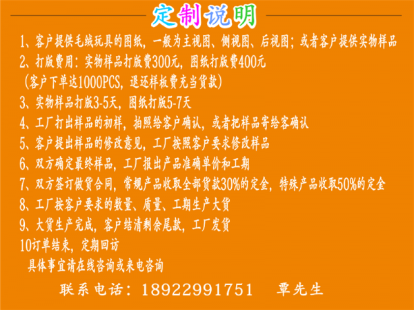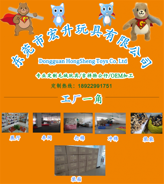 After years of hard work and hard struggle, hongsheng strength is increasingly strengthened, after continuous optimization of the combination, in the industry has won a good reputation.At present, the company's main projects include: design and production of plush toys, mascots, gifts, promotional products, animation patent image, cartoon doll, simulation toys, cushion and pillow and bedding, clothing, clothing, advertising shirt, T-shirt household products, cloth art automotive supplies, golf supplies and other indoor and outdoor decoration products.Hongsheng toys not only sell well throughout the country, but also exported to foreign countries, by the majority of customers trust and praise.