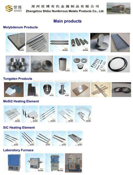 We're professional manufacturer of molybdenum and tungsten products, MoSi2 and SiC heating element, laboratory furnace. Our products are exported toUSA, Europe, Middle East and Southeast Asia, etc. We're a factory with ISO quality system certification. We can produce as per customer's request and provide products with good quality and best price!