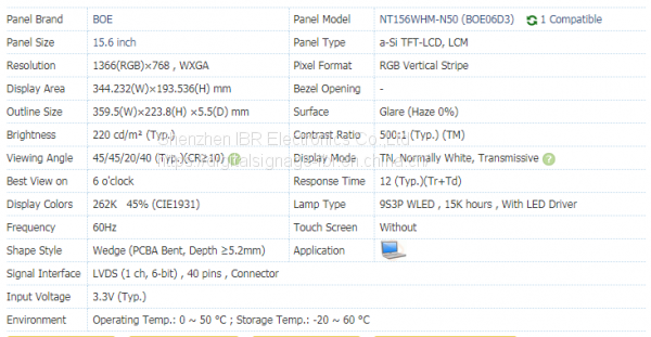 Laptop screen 18.5 inch 1366x768 RGB lcd display NT156WHM-N50 lcd panel