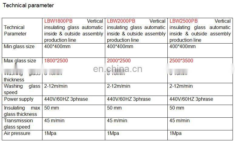 LBW2500PBVertical Automatic Insulating Glass Outside Assembly Flat Press Production Line is a high-efficiency insulating glass processing equipment. This line can not only produce ordinary insulating glass but also for low-e insulating glass. It is a better mass production equipment to produce insulating glass with high automatic degree, high efficiency, easiness of operation and maintenance.It has seven parts: