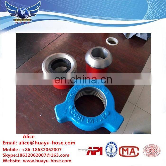 Figure 1502 hammer union have replaceable lip type rubber seal , can used in high pressure systems because the union have wall thickness and stoutness design . These hammer union have blue nut and red subs , recommended service cementing ,fracturing ,acidizing ,testing , and choke-and-kill lines also used for non-pressure seal configurations . Available for sour gas service of 10000psi cold working pressure . It’s cold working pressure 15000PSI ,test pressure 22500PSI .Available in threaded and butt weld end connections .